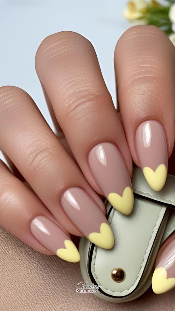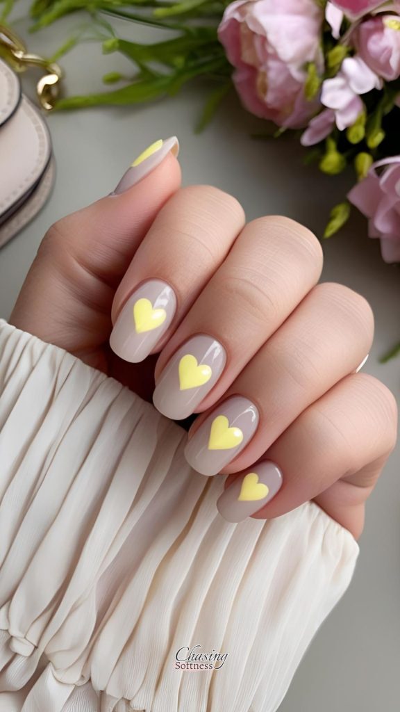A minimalist base (nude or sheer pink) with tiny butter yellow hearts on each nail. Whimsical. Sweet. Pinterest-core.