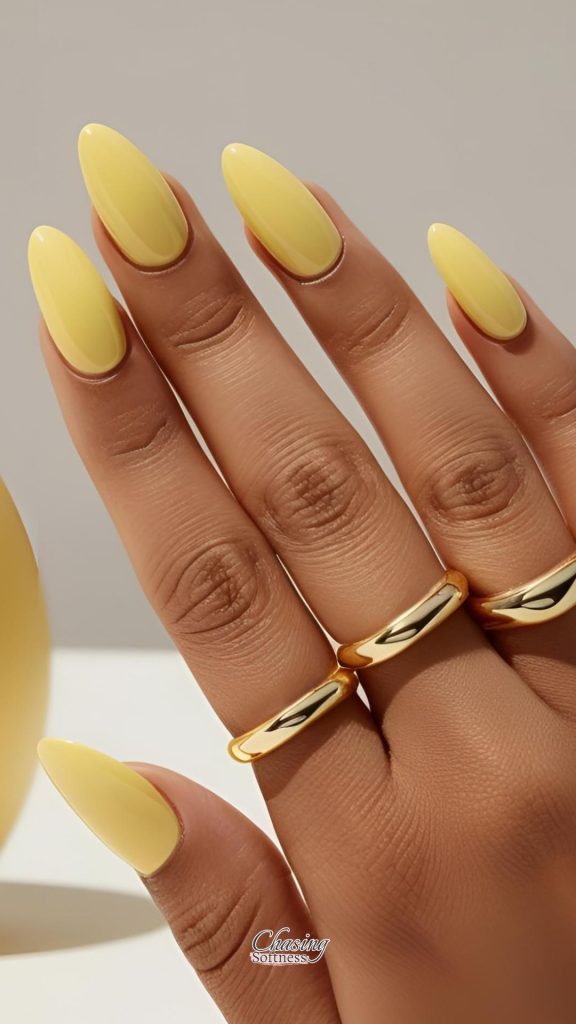 A glossy, short nail in solid butter yellow? Instant soft girl. Pair it with gold rings and iced coffee and you’re good to go.