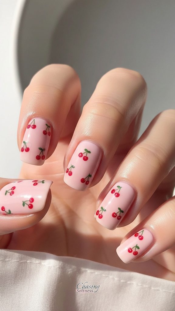 1. Cherry On Top 🍒 – Summer Cherry Nail Designs